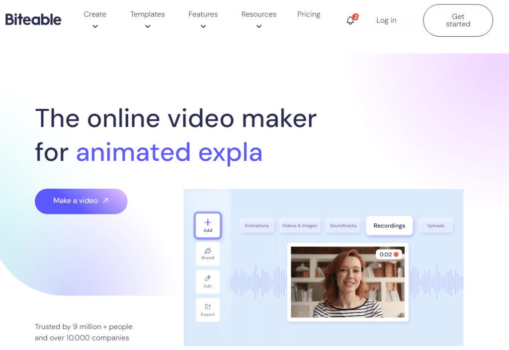 Biteable ile izleyicilerin ilgisini çeken, onları etkileyen animasyonlu video sunumları oluşturulabiliyor. Bu animasyonlu video sunum aracı esas olarak kurumsal odaklı olduğundan, önceden hazırlanmış tasarım öğeleri grafikler, çizelgeler ve daha fazlası gibi birçok gelişmiş karakter içerir. Video sunumları yalnızca yüz yüze konuşmalar yapmakla kalmaz, aynı zamanda eş zamanlı olmayan toplantılar, canlı toplantılar ve video raporları da sağlar. Biteable, kullanıcıların animasyonlu video sunumlarını, sahne ekleme veya kaldırma, görsellerini veya video kliplerini yükleme ve hatta seslendirme ekleme dahil olmak üzere birçok yolla özelleştirmelerine olanak tanır. Kullanıcılar şaheserlerini e-posta, Microsoft Team veya WhatsApp yoluyla paylaşabilirler.