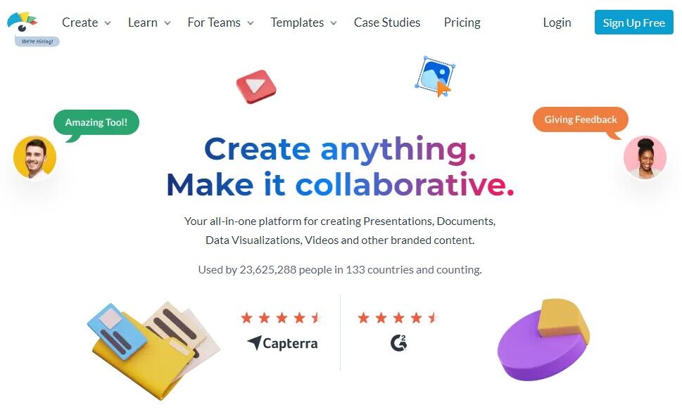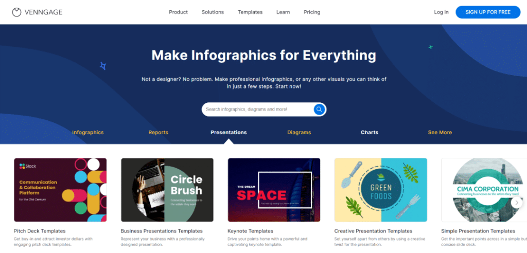 Venngage Sunumları, esas olarak kullanıcıların sıkıcı belgelerini, kuru verilerini ve kafa karıştırıcı iletişimlerini çarpıcı infografiklere dönüştürmeye odaklanan animasyonlu bir sunum aracıdır. Bu ayırt edici özelliğiyle iş iletişimi sunumlarınızı farklılaştırmanıza yardımcı olacaktır. Video sunumlarınızı güzel simgeler, fotoğraflar, grafikler ve resimlerle canlandırabilirsiniz. Venngage aynı zamanda ekip çalışmasını da dikkate alır, böylece ekibinizi gerçek zamanlı olarak oluşturma sürecinde işbirliği yapmaya davet edebilir, ardından geri bildirim alabilir, uyum sağlayabilir ve sonuç alabilirsiniz.