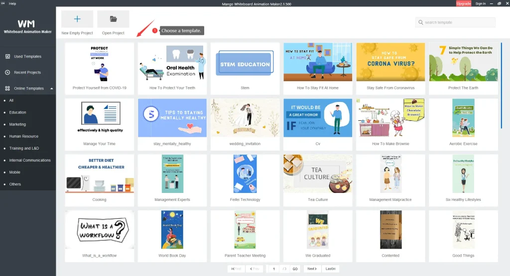 Mango Beyaz Tahta Animasyon Aracı, aralarından seçim yapabileceğiniz çeşitli şablonlara sahiptir. Konunuza uygun bir şablon seçebilir veya bir şablonu beğeninize göre özelleştirebilirsiniz. Şablonlar, videonuzu geliştirmek için kullanabileceğiniz önceden hazırlanmış animasyonlar ve grafiklerle birlikte gelir.