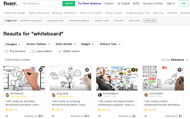 Sau khi bạn có quyền truy cập vào Fiverr.com, hãy xem hợp đồng biểu diễn của họ để biết các video về bảng trắng và nền tảng dành cho người làm nghề tự do sẽ đưa ra nhiều video về bảng trắng do các dịch giả tự do đăng. Bạn có thể chọn một video đáp ứng nhu cầu của mình và mua video đó. Giá của video thông thường bắt đầu từ $5, trong khi Dịch vụ Pro bắt đầu từ $500.